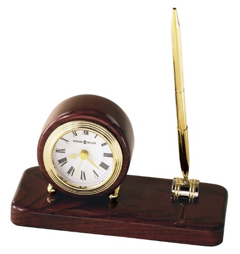 The Roland Table Clock by Howard Miller has a high-gloss, Rosewood Hall finish on select hardwoods with a solid brass pen. White dial with triple brass-tone bezel and black hands. Pen is compatible with AT Cross refills.